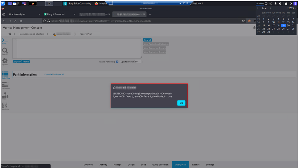 Due to this Reflected Cross-Site Scripting (XSS) vulnerability an attacker can gain the full access to the Databases managed through the web application. Exploiting this vulnerability an attacker can steal the session cookie of any user. Using the stolen cookie an attacker can log into the web application without the user’s password. Once logged the user can use the web application to interact with the database.