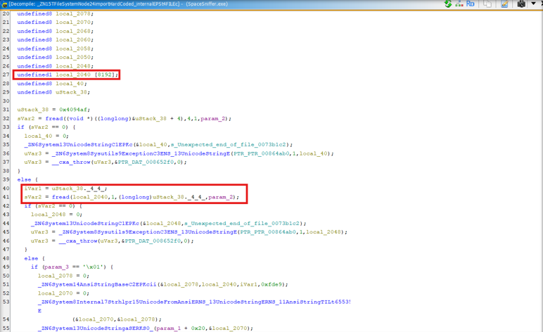SpaceSniffer parses proprietary snapshot files using an attacker-controlled length value as the fread() size for a fixed 8192-byte stack buffer, without bounds checking. A crafted .sns file can trigger stack memory corruption and be leveraged for abitrary code execution in the context of the user opening the snapshot.