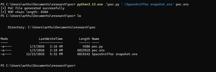-        Demonstrated impact (PoC): Arbitrary Code Execution in the context of the user running SpaceSniffer (DEP bypass demonstrated via ROP; PoC uses a benign MessageBoxW call as evidence of execution).